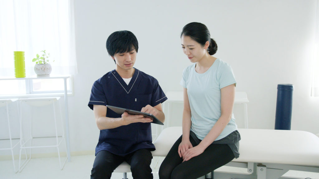 リハサクは、タブレットやスマートフォンを使って、病院で指導された運動をご自宅でも動画で確認・実践できるサポートシステムです。